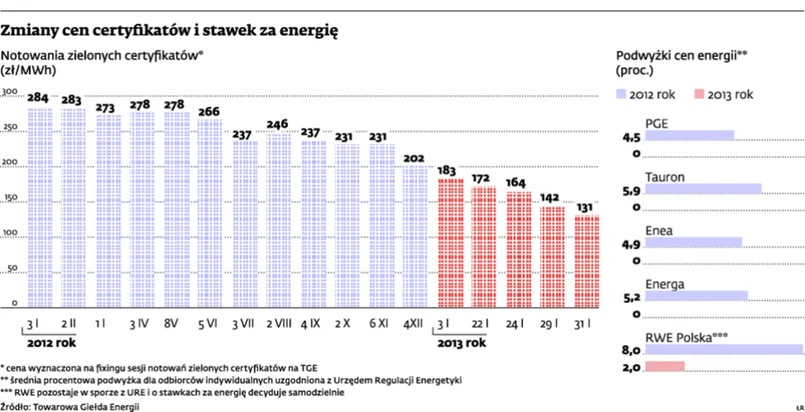 Jak twierdzi Michał Ćwil, dyrektor generalny Polskiej Izby Gospodarczej Energetyki Odnawialnej, sprzedawcy powinni byli obniżyć ceny. Według jego szacunków, jeśli RWE Polska utrzyma wielkość sprzedaży energii do odbiorców końcowych, oszczędności spółki z tytułu zielonych certyfikatów liczone będą w 2013 r. w dziesiątkach milionów złotych. Zdaniem Ćwila już w grudniu, kiedy spółka informowała o podwyżce, powinna była obniżyć stawkę za 1 MWh o ok. 8 zł.