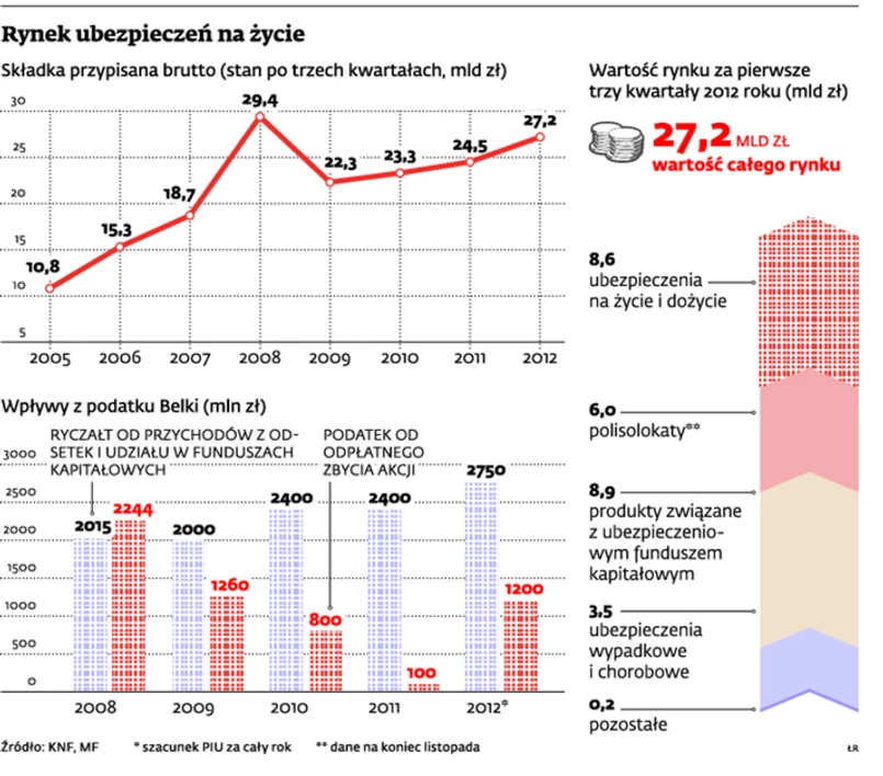 Może się więc okazać, że 2013 r. będzie ostatnim, w którym rynek produktów ubezpieczeniowych o charakterze inwestycyjnym będzie rósł. Dotąd co roku notowano kilkunastoprocentowe wzrosty – nie ma jeszcze pełnych danych za 2012 r., ale w 2011 r. odnotowano w tym segmencie skok o 14 proc. Zatem wpływy z podatku Belki wcale nie muszą bardzo wzrosnąć. W 2011 r. sięgnęły one 2,4 mld zł, w 2012 r. najprawdopodobniej już ok. 2,8 mld zł.