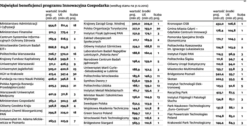 Na podstawie danych Ministerstwa Rozwoju Regionalnego DGP przygotował listę 50 największych beneficjentów Programu Operacyjnego Innowacyjna Gospodarka. Najważniejszy wniosek – za mało pieniędzy trafiło dotąd do biznesu.
