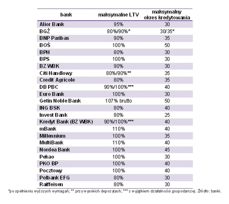 W ostatnich dniach BGŻ zdecydował się na obniżenie maksymalnego LtV (relacja kredytu do dochodów) ze 100 na 80 proc. wartości nieruchomości. Skrócił też standardowy okres kredytowania z 40 do 30 lat. Gotów jest zrobić wyjątek i pożyczyć na 90 proc. ceny zakupu, ewentualnie na 80 proc. i 35 lat, ale tylko wobec osób ze stabilnymi dochodami. Aby sobie jednak zasłużyć na miano osoby ze stabilnymi dochodami, trzeba spełnić zdecydowanie bardziej rygorystyczne wymagania niż wcześniej. Szczególnie trudniej jest osobom prowadzącym działalność gospodarczą, które w pełni wiarygodne stają się dla banku dopiero po czterech latach uzyskiwania dochodów, podczas gdy wcześniej wystarczył im rok. W przypadku etatu zamiast wcześniejszych trzech miesięcy stażu u jednego pracodawcy konieczne jest teraz sześć miesięcy.