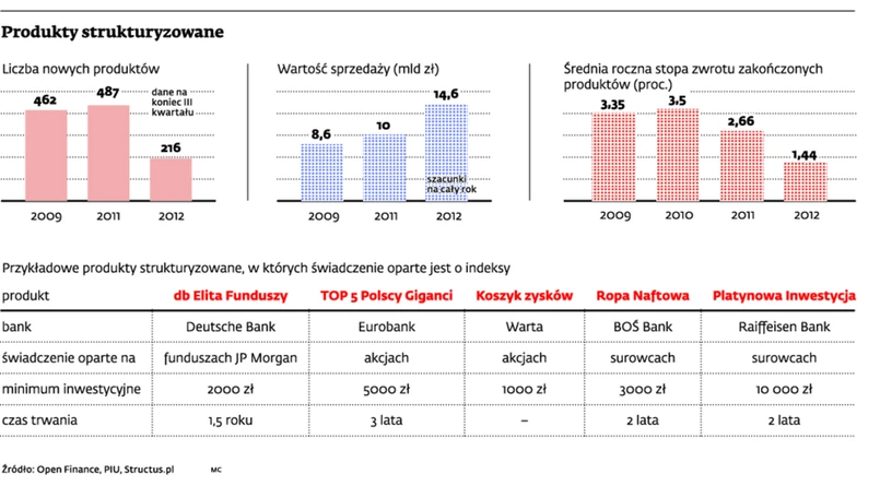 Mariusz Zagajewski, dyrektor departamentu indywidualnych ubezpieczeń na życie i emerytalnych Generali, dodaje, że do spadku popularności produktów strukturyzowanych przyczyni się też to, że coraz mniej będzie można na nich zarobić. – Popularność tego segmentu rynku będzie malała wraz ze spadkiem średniej stopy zwrotu w skali roku – zaznacza. – W 2010 roku można było na nich średnio zarobić 3,5 proc., w 2011 roku 2,66 proc., a w ubiegłym już tylko 1,44 proc. Tylko co drugi taki produkt przynosił zysk – dodaje.