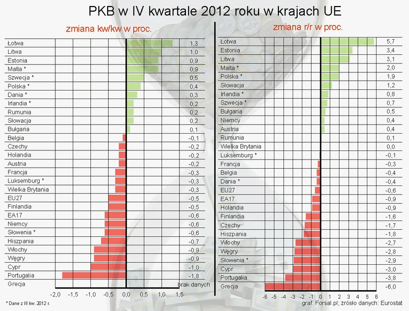 Eurostat nie podał danych dla Polski. Dane za IV kwartał dla Polski nie zostały również jeszcze opublikowane przez GUS, jednak na podstawie danych za cały rok 2012 ekonomiści wyliczyli PKB w IV kwartale. Główny ekonomista BZ WBK Maciej Reluga powiedział portalowi Forsal.pl, że dane te wskazują na wzrost w IV kwartale na poziomie ok. 1 proc., natomiast ekonomista PKO BP Michał Rot uważa, że wzrost ten wyniósł 0,9 proc. Dawałoby to Polsce 5. miejsce w UE pod względem tempa wzrostu.