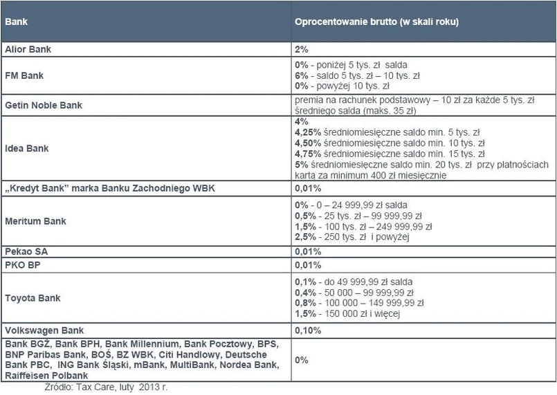 Większość proponowanych przez banki stawek jest jednak bardzo niska – oprocentowanie rachunków firmowych rozpoczyna się od 0,01% w skali roku („Kredyt Bank” marka BZ WBK, Peako SA oraz PKO BP), co oznacza, że przy saldzie na firmowym rachunku bieżącym w wysokości 35 tys. zł miesięczne odsetki wyniosą w tych bankach niespełna 30 gr brutto.