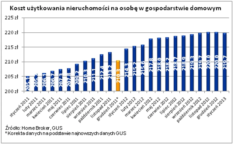 Na utrzymanie mieszkania, podobnie jak w przypadku koszyka inflacji, składają się koszty eksploatacyjne, energii i wody. Na podstawie tempa wzrostu cen można szacować, że dziś na utrzymanie mieszkania czteroosobowa rodzina wydaje mniej niż przed miesiącem, czyli 879 zł. Z taką sytuacją nie mieliśmy do czynienia od stycznia 2011 roku, od kiedy Home Broker szacuje przeciętne koszty utrzymania nieruchomości. Niemniej jednak w ciągu ostatnich 12 miesięcy koszty te podniosły się o 21,6 zł.
