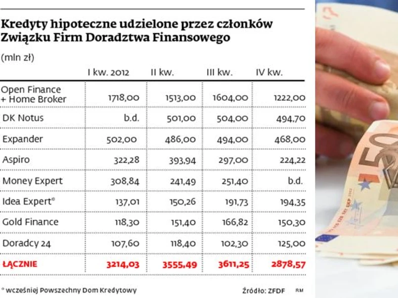 Niekwestionowanym liderem wśród firm pośredników finansowych jest wciąż Open Finance (wraz z Home Broker). Jednak jak wynika z danych publikowanych przez ZFDF, udział tej firmy w rynku kredytów hipotecznych stale spada. Jeszcze na początku tego roku ponad połowa tego typu kredytów udzielanych przez pośredników przechodziła właśnie przez Open Finance. W ostatnim kwartale ten odsetek spadł do około 42,5 proc. (trzeba tu dodać, że w statystykach I kw. 2012 r. ZFDF nie uwzględnił wyników DK Notus).