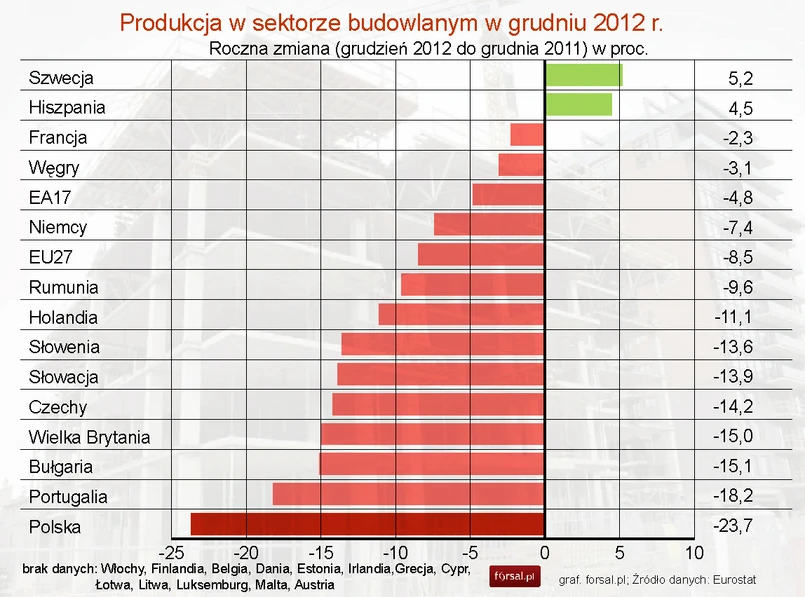 W ujęciu rocznym produkcja w sektorze spowolniła w dwunastu krajach i przyspieszyła w dwóch. Najbardziej ucierpiał sektor budowlany wPolsce (-23,7 proc.), Portugalii (-18,2 proc.), Bułgarii (-15,1 proc.) i Wielkiej Brytanii (-15,0 proc.), natomiast wzrost nastąpił w Szwecji (+5.2 proc.) i Hiszpanii (+4,5 proc.).