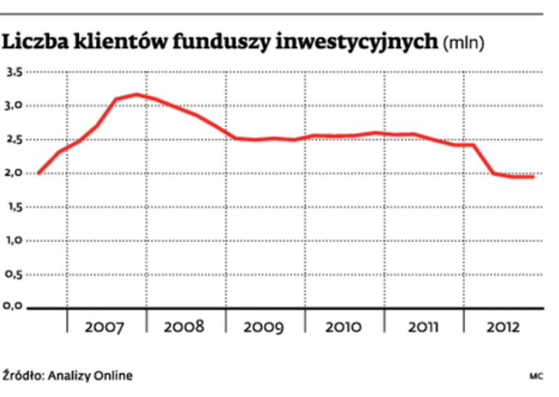 W końcówce ubiegłego roku znów spadła liczba osób, które inwestują za pośrednictwem TFI, a jednocześnie urosła przeciętna wartość aktywów przypadających na jednego klienta funduszu. Na koniec 2012 r. 20 towarzystw funduszy inwestycyjnych, z których Analizy Online zebrały dane, miało w sumie 1,94 mln klientów. Kwartał wcześniej było ich 1,95 mln, zaś rok wcześniej o blisko pół miliona więcej.