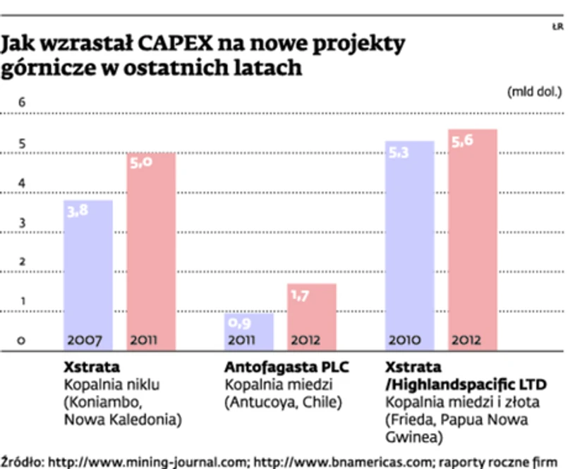 Tak było np. w przypadku inwestycji realizowanej przez Xstrata/Highlands Pacific Ltd. – kopalni miedzi i złota Frieda (Papua Nowa Gwinea). Odnotowano tam wzrost CAPEX o 300 mln USD (wiązało się to ze spadkiem wartości dolara). W listopadzie 2010 wyceniono projekt na 5,3 mld USD, obecnie jest on wyceniany na 5,6 mld USD. Inny przykład to kopalnia niklu Xstraty (Koniambo, Nowa Kaledonia). W 2007 CAPEX oceniono na 3,8 mld USD, w sierpniu 2011 na skoczył on do 5 mld USD.