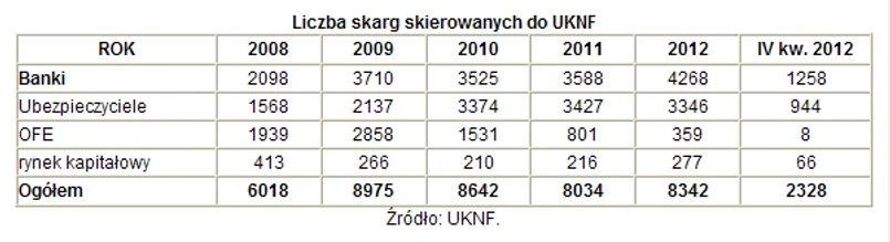 Na 8324 skargi złożone przez klientów instytucji finansowych nadzorowanych przez Komisję Nadzoru Finansowego, 4268 dotyczyło w zeszłym roku banków. To ponad połowa wszystkich skarg, choć wcześniej sektor bankowy nie miał tak znaczącego udziału. Liczba blisko 4,3 tys. zgłoszeń jest również o niemal jedną piątą wyższa niż rok wcześniej.