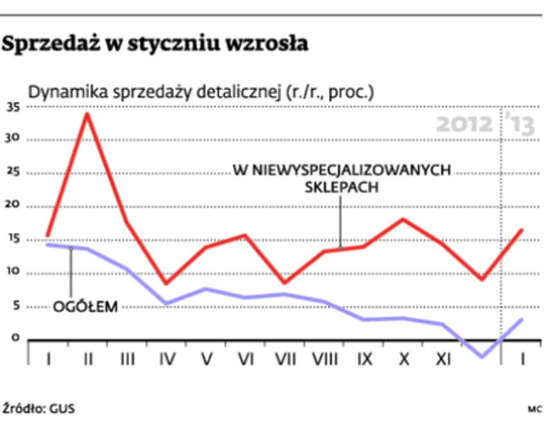 Mimo to w opiniach ekspertów euforii nie widać. Zwracają uwagę, że oprócz samochodów motorem sprzedaży były wyniki niewyspecjalizowanych sklepów. Do tej kategorii GUS wrzuca duże dyskonty, supermarkety i hipermarkety. Sprzedaż w nich wzrosła w styczniu o 16,5 proc. rok do roku. Ten wynik nie musi jednak oznaczać rosnącego popytu – to raczej efekt dynamicznego rozwoju sieci handlowych i przenoszenia się do nich obrotów z małych osiedlowych sklepów oraz bazarów. Sklepiki i bazary do tej pory wymykały się oficjalnej statystyce, bo GUS uwzględnia dane z podmiotów zatrudniających co najmniej 9 pracowników. Wraz z przeniesieniem się do dyskontów ta część obrotów w handlu „statystycznie” się ujawniła.