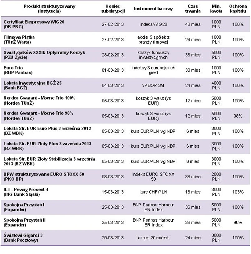 Kilkanaście różnorodnych ofert produktów strukturyzowanych dostępnych w tym samym czasie – z takim bogactwem wyboru klienci nie mają do czynienia często. Od początku roku instytucje finansowe zaktywizowały się w temacie opracowywania kolejnych ofert produktów strukturyzowanych. Z danych firmy Analizy Online wynika, że zainteresowani mogą wybierać spośród struktur opartych m.in. na indeksach giełdowych (WIG20, Euro Stoxx 50 i inne), akcjach spółek, kursach CHF/PLN i EUR/PLN oraz kilku innych instrumentach.