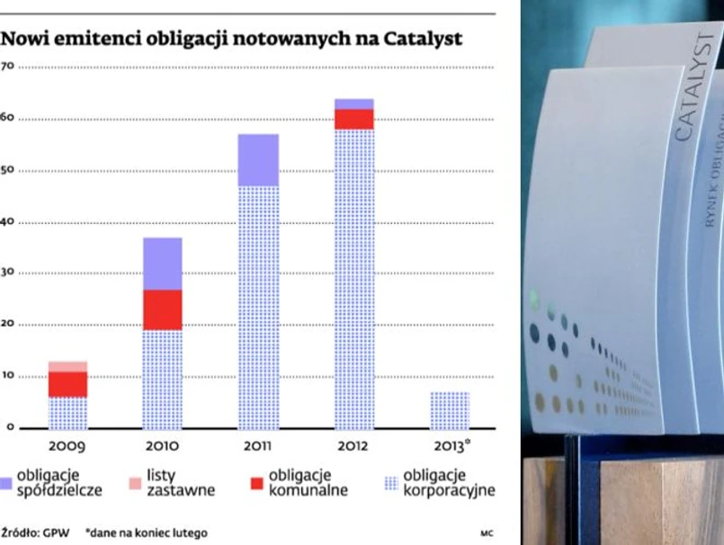 W zeszłym roku na Catalyst zadebiutowało 64 emitentów. W tym może ich być więcej. Niektóre biura maklerskie i banki zapowiadają, że wprowadzą na rynek nawet po kilkanaście emisji. – Obserwujemy dużo większe zainteresowanie pozyskaniem finansowania poprzez emisję długu niż poprzez sprzedaż akcji – komentuje Maciej Kałowski, makler w DM AmerBrokers. Także Konrad Sobczyk, główny specjalista ds. emisji w Raiffeisen Polbanku, zauważa wzrostową tendencję, jeśli chodzi o liczbę emisji wprowadzanych na Catalyst. – To zasługa nie tylko większych wymagań inwestorów czy też korzyści wizerunkowych, lecz także większej płynności w porównaniu z rynkiem pozagiełdowym – uzasadnia ekspert.