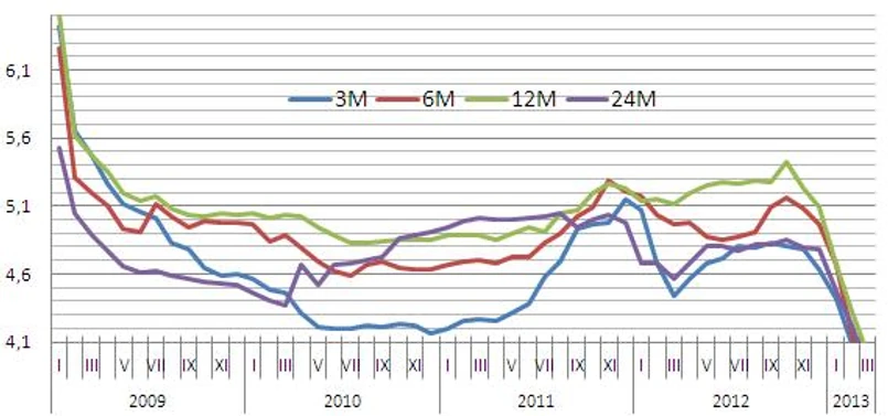 Od szczytu przypadającego na październik 2012 r. średnie oprocentowanie trzymiesięcznych lokat spadło o 0,98 pkt proc. Depozyty sześciomiesięczne dają zarobić o 1,27 pkt proc. mniej. Oprocentowanie rocznych lokat spadło w pięć miesięcy o 1,41 pkt proc., a dwuletnich o 0,94 pkt proc. Dla porównania, stopa referencyjna Narodowego Banku Polskiego została w tym czasie obniżona z 4,75 proc. do 3,75 proc., a stawka WIBOR 3M spadła o 1,19 pkt proc. do 3,73 proc.