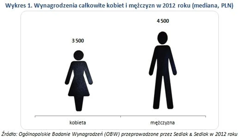 Jak wynika z Ogólnopolskiego Badania Wynagrodzeń, przeprowadzonego przez firmę Sedlak & Sedlak, w 2012 roku mediana całkowitego wynagrodzenia brutto kobiet kształtowała się na poziomie 3 500 zł. Tymczasem panowie zarabiali 4 500 zł.