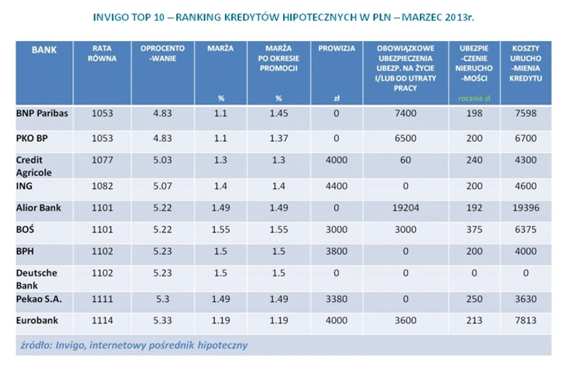 W niniejszym rankingu, tradycyjnie już, prezentujemy aktualne promocje i oferty specjalne. Wynikiem tego są zmiany w rankingu INVIGO TOP 10, przygotowywanym przez ekspertów pośrednika na początku każdego miesiąca. Zestawienie powstaje w oparciu o aktualne oferty banków współpracujących z firmą. Na potrzeby rankingu analitycy Invigo badają także zdolność kredytową klienta osiągającego przeciętne dochody, a także tradycyjnej polskiej rodziny „2+2”. Eksperci Invigo zwracają uwagę na fakt, że poszukując najatrakcyjniejszego kredytu dla siebie warto brać pod uwagę nie tylko wysokość comiesięcznej raty, ale także pozostałe parametry kredytu oraz opłaty dodatkowe, jakie się z nim wiążą.