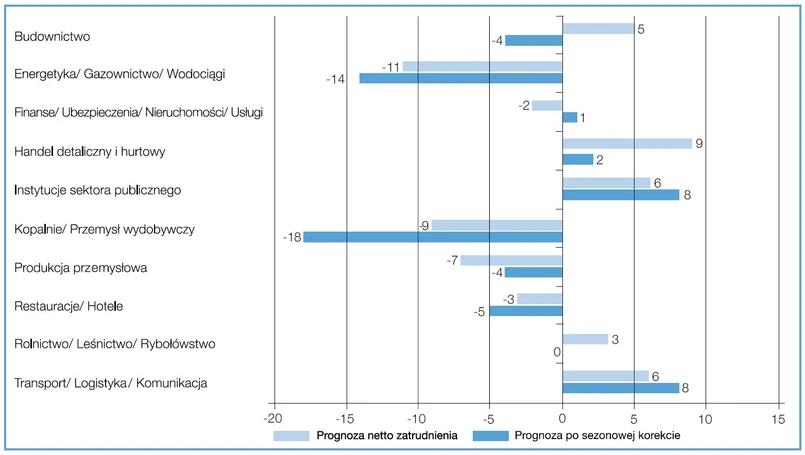 W ujęciu sektorowym natomiast aż w 5 z 10 badanych sektorów gospodarki planuje się zmniejszenie zatrudnienia. Najgorzej pod tym względem wypadły energetyka, gazownictwo, wodociągi (-14 proc.) oraz przemysł wydobywczy (-18 proc.).