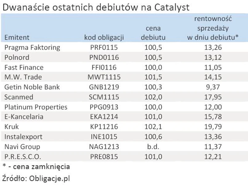 Z dwunastu ostatnich debiutów obligacji korporacyjnych na Catalyst dziewięć miało miejsce powyżej ceny nominalnej (a więc także emisyjnej), dwa zadebiutowały z ceną nominalną, a dla jednego dotąd nie wyznaczono ceny transakcyjnej. Oznacza to, że we wszystkich tych przypadkach (w wyliczeniach pominąłem debiuty na BondSpot, który zarezerwowany jest dla inwestorów instytucjonalnych oraz obligacje Nickel Development, które zadebiutowały ponad dwa i pół roku od daty emisji, aczkolwiek także powyżej nominału) zakup obligacji przyniósł ich posiadaczom dwucyfrowy zysk, nawet jeśli samo oprocentowanie wyrażało się wartością jednocyfrową. Wyjątkiem są papiery Getin Noble Banku oprocentowane na 7,61 proc., które w dniu debiutu można było sprzedać po 100,3 proc., co łącznie dało 9,37 proc. rentowności rocznej. Najlepszą przebitkę można było uzyskać na obligacjach Kruka, które weszły na rynek w połowie lutego z ceną 102,1 proc. - sprzedaż po tym kursie dawała 19,79 proc. rentowności w skali roku z inwestycji trwającej zaledwie 71 dni.