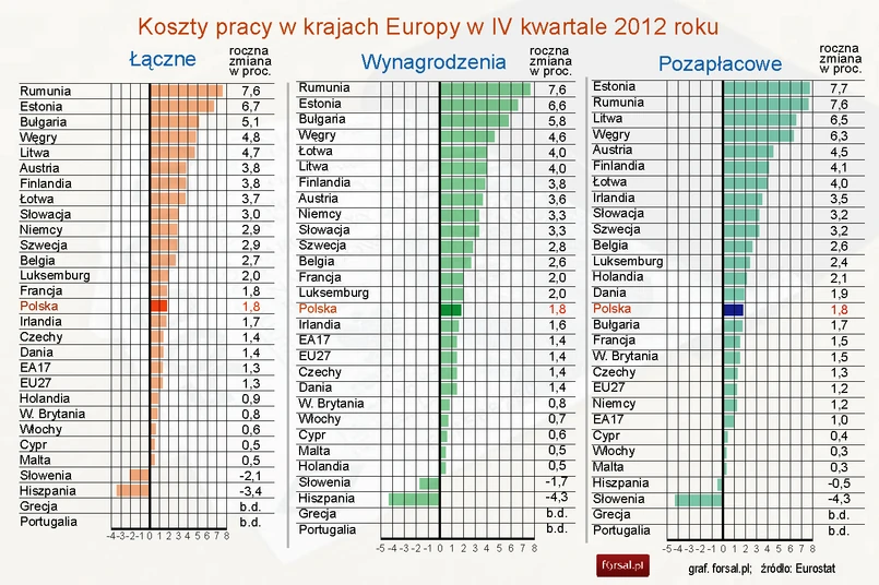 Krajami, w których zanotowano największe wzrosty kosztów zatrudnienia w IV kw. 2012 rok do roku, są Rumunia (wzrost o 7,6 proc.), Estonia (wzrost o 6,7 proc.). Z największymi spadkami zaś mieliśmy do czynienia w Hiszpanii (-3,4 proc.) oraz w Słowenii (-2,1 proc.).