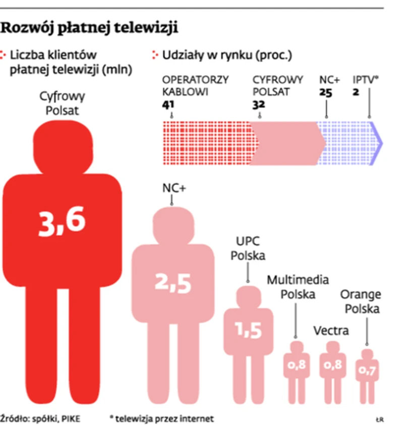 – NC+ najpierw skupi się na obronie swojej bazy klientów, bo ryzyko utraty części z nich zawsze rośnie przy łączeniu się operatorów. Części klientów kończą się umowy, część korzystała dotychczas z obu platform i na pewno będzie chciała teraz zmniejszyć swoje miesięczne koszty – tłumaczy Waldemar Stachowiak, analityk biura maklerskiego Ipopema Securities. Dziś NC+ ma 2,5-mln bazę abonentów. A konkurenci – platforma Cyfrowy Polsat oraz kablówki UPC Polska, Multimedia Polska czy Vectra – tylko czekają, aż NC+ powinie się noga, i będą próbowali przejąć od niego jak najwięcej abonentów.