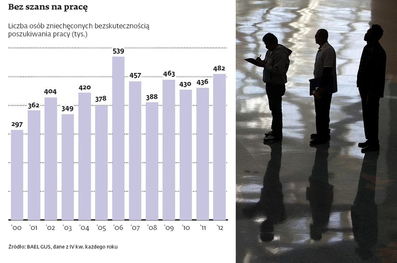 W czwartym kwartale ubiegłego roku takich bezrobotnych było 482 tys., rok wcześniej o 46 tys. mniej. W minionych dwunastu latach tylko w jednym roku ich liczba była wyższa – w 2006 r. Nie ma wątpliwości, że jej obecny wzrost ma związek z sytuacją na rynku pracy. W 2006 r. bezrobocie wynosiło 14,8 proc., podczas gdy w marcu tego roku wzrosło do 14,4 proc. i można się spodziewać, że wzrosła także liczba osób biernych pod względem poszukiwania pracy.