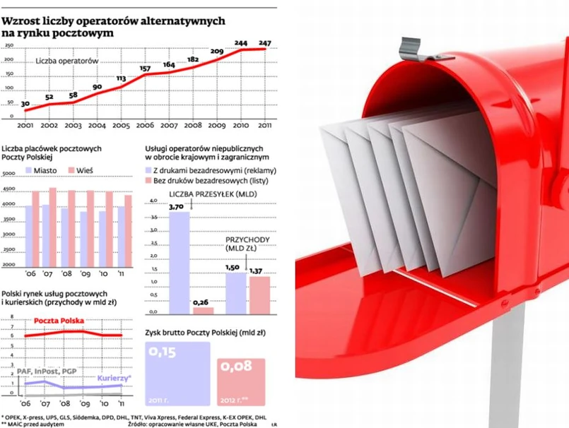 Według urzędu na rynku działa obecnie ponad 200 operatorów pocztowych. Większość to gracze lokalni, niezainteresowani ekspansją ogólnopolską, ale są wśród nich tacy, jak Angaria, Polska Grupa Pocztowa, Polskie Centrum Doręczeniowe „Petrox” czy PS-T Avistrans, którzy chcą korzystać z liberalizacji rynku i rosnąć kosztem PP. Obecnie narodowy monopolista ma ponad 90-proc. udział w rynku, którego wartość rocznie wyceniana jest na ok. 6,6 mld zł.