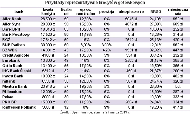 Z opisu reprezentatywnej oferty w Invest Banku można się dowiedzieć natomiast, że koszt prowadzenia rachunku w okresie kredytowania wyniesie 15 zł miesięcznie. Meritum Bank małą czcionką informuje z kolei, że kredyt z oprocentowaniem „od 5,9 proc .” według reprezentatywnego przykładu oprocentowany będzie jednak na 19,9 proc. w skali roku, a do tego bank pobierze 10 zł miesięcznie opłaty operacyjnej za obsługę zadłużenia. Nie mniej ciekawym przypadkiem jest Alior Sync - bank promuje swoją ofertę hasłem „rata tylko 17 zł za każdy 1000 zł pożyczki”. Tymczasem z reprezentatywnego przykładu (28 tys. zł na 58 miesięcy) wynika, że na każdy tysiąc złotych pożyczki przypada nie 17 zł raty, a znacznie więcej, bo 24,61 zł.