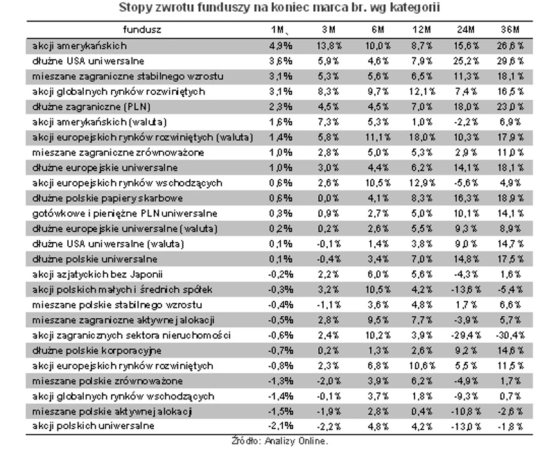 Podobnie jak i w marcu, najlepszą inwestycją pierwszego kwartału były fundusze akcji amerykańskich (średnio 13,8 proc. zysku), a najgorsza fundusze akcji polskich uniwersalne (średnio 2,2 proc. straty).