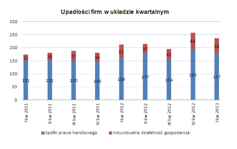 W pierwszym kwartale 2013 roku według danych Monitora Sądowego i Gospodarczego liczba upadłości przedsiębiorstw w Polsce wyniosła 235. To o 11,4 proc. więcej niż w I kw. 2012 roku i o 35,8 proc. więcej niż w pierwszych trzech miesiącach roku 2011 – podaje Korporacja Ubezpieczeń Kredytów Eksportowych (KUKE).