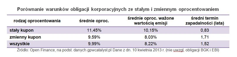 Wybór obligacji ze stałym oprocentowaniem naturalnie jest sposobem na uniezależnienie stopy zwrotu od decyzji Rady Polityki Pieniężnej czy samych oczekiwań rynku wobec tych decyzji, ale warto zwrócić na kilka istotnych szczegółów. Po pierwsze, lista dostępnych dla inwestorów indywidualnych na Catalyst obligacji korporacyjnych jest stosunkowo krótka. Liczy ona bowiem 43 serie obligacji (wyemitowanych przez 28 podmiotów) i stanowi niewiele ponad 21 proc. wszystkich obligacji spółek (stało- i zmiennokuponowych) na warszawskim parkiecie. Po drugie, średni termin zapadalności obligacji ze stałym oprocentowaniem wynosi niespełna 10 miesięcy wobec przeszło 20,5 dla papierów ze zmiennym kuponem. Widać więc, że emitenci niechętnie decydują się na kolejne oferty obligacji ze stałym oprocentowaniem. A jeśli już, to zwykle kupon jest zauważalnie niższy – przykładowo PCC Rokita najpierw obniżyła stałe odsetki z 9 do 8,3 proc., a w najnowszej ofercie proponuje jeszcze mniej, bo 7,5 proc.