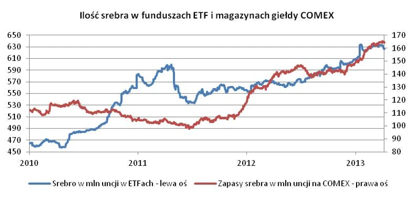 Na rynku srebra co prawda nie widać jeszcze tak dużego odpływu środków z funduszy ETF jak na rynku złota, lecz od początku 2013 r. popyt na srebro ze strony inwestorów nie rośnie, a popyt „realny” (przemysł+jubilerzy+branża fotograficzna+zastawy stołowe) lekko spada. Czynniki te przekładają się nie tylko spadające ceny, ale także cały czas rosnący poziom zapasów srebra na giełdzie w Nowym Jorku.