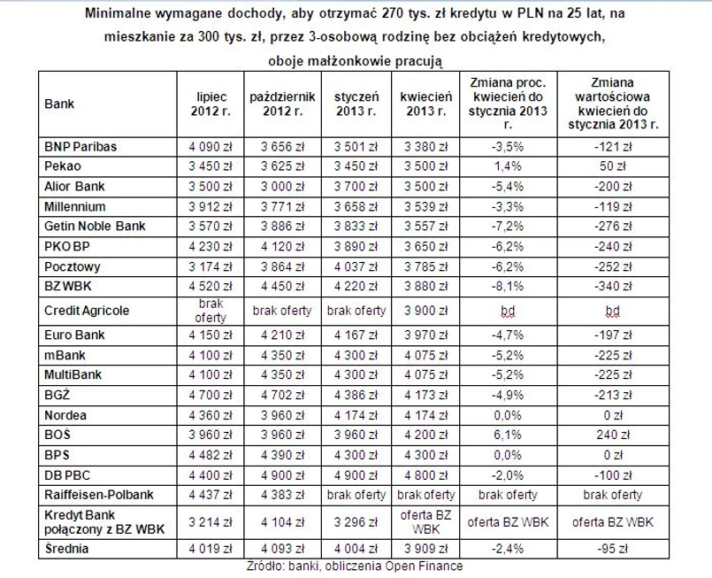 Wśród 19 prezentowanych instytucji od stycznia, tylko dwie zdecydowały się na podwyższenie minimalnych dochodów potrzebnych do uzyskania 270 tys. zł w 25-letnim kredycie, dwa też nie zmieniły oczekiwań, a pozostałe obniżyły wymagania. Podobnie zresztą było w poprzednim kwartale co koniec końców zaowocowało sporą obniżką progu dochodowego.