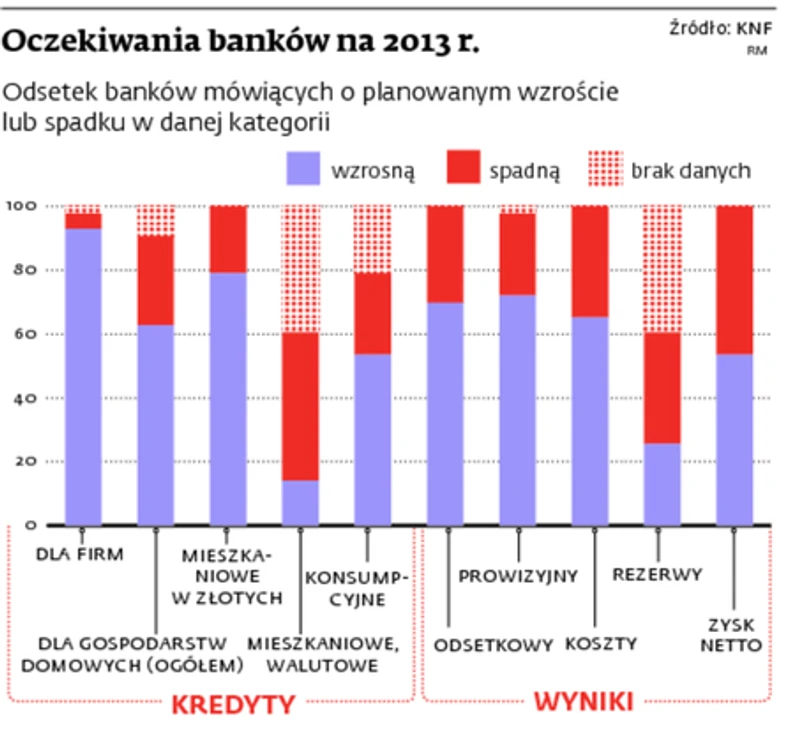 – To zaskakujący wzrost. Te prognozy są megaoptymistyczne – komentują analitycy. Dlaczego? Gdy pytać o przewidywania poszczególne banki, mowa jest zwykle o zwiększeniu skali kredytów dla firm o nie więcej niż 10 proc. Zwyżka, o jakiej bankowcy mówią nadzorowi, oznaczałaby powrót popytu na kredyt z okresu boomu gospodarczego sprzed wybuchu kryzysu finansowego z 2008 r. (tymczasem w całym 2013 r. oczekiwany jest wzrost PKB rzędu 1,5 proc.). Chyba że tak duży wzrost miałyby dać kredyty na wielkie projekty w ramach programu Inwestycje Polskie oraz dla małych firm – z poręczeniami państwowego Banku Gospodarstwa Krajowego.