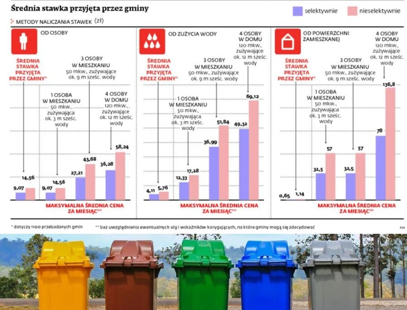 Samorządy, które zdecydowały się ustalać opłaty od osoby, uchwaliły średnie stawki na poziomie 9,07 zł za posegregowane śmieci (14,56 zł za zbiórkę nieselektywną). Przy metodzie od gospodarstwa domowego średnia stawka wynosi 16,87 zł (26,52 zł). Gminy naliczające stawki od zużycia wody przyjęły średnie rozliczenia 4,11 zł za 1 m sześc. zużytej wody (5,76 zł). W ostatniej dostępnej metodzie – od powierzchni zamieszkałej – selektywna zbiórka kosztuje średnio 0,65 zł za 1 mkw. (lub 1,14 zł za śmieci nieposegregowane).