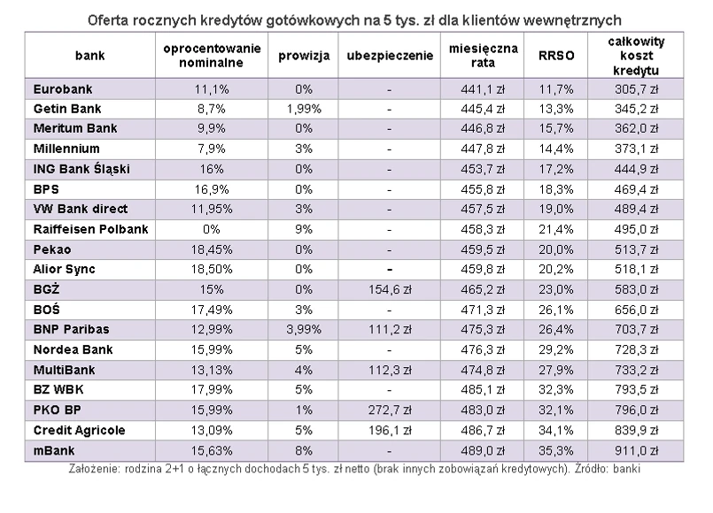 Najtańszy roczny kredyt na 5 tys. zł w przygotowanym przez Open Finance rankingu oferuje Eurobank, któremu po roku klienci będą musieli oddać 306 zł więcej ponad to co pożyczyli. Na drugim miejscu znajduje się o 40 zł droższa oferta Getin Banku. Trzeci zaś jest Meritum Bank, w którym całkowity koszt kredytu podliczono na 362 zł. W grupie instytucji, które każą sobie płacić nie więcej niż 400 zł znalazł się także Bank Millennium.