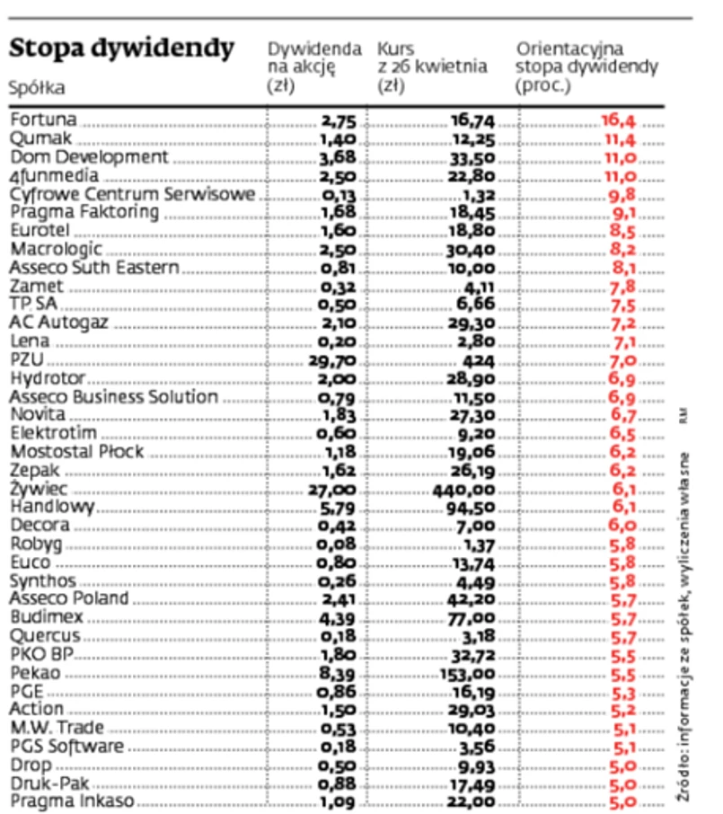 Roman Przasnyski, analityk Open Finance, ocenia, że stosunkowo wysokie stopy dywidend powinny przyciągnąć na giełdę nowych inwestorów, którzy dziś zastanawiają się nad opłacalnością np. bankowych lokat. Rekordzista to czeska Fortuna, gdzie stopa dywidendy przekracza 16 proc. Ale w pierwszej trzydziestce jest aż sześć spółek wchodzących w skład indeksu WIG20, m.in. Telekomunikacja Polska (7,79 proc.), PZU (7 proc.) czy Bank Handlowy (6,13 proc.).