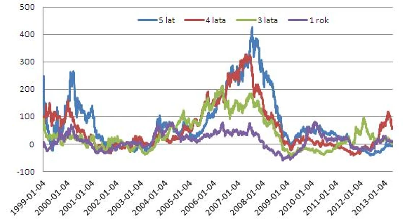 Obserwacja danych dotyczących zmian indeksu szerokiego rynku w ciągu ostatnich 14 lat dostarcza argumentów zwolennikom inwestowania długoterminowego. Przyjęcie 5-letniego horyzontu nie tylko pozwalało ograniczyć skalę strat w czasie okresów giełdowej dekoniunktury, ale jednocześnie umożliwiało osiągnięcie wyższych zysków, niż przy zastosowaniu inwestycji o krótszym horyzoncie, w czasach hossy. W okresie załamania po pęknięciu bańki internetowej, najwyższa strata przy zastosowaniu horyzontu 5-letniego wynosiła 23 proc., przy okresie o rok krótszym było to 28 proc., w czasie trzech lat spadek przekroczył 40 proc., a w horyzoncie rocznym 36 proc. Z podobną sytuację mieliśmy do czynienia w czasie krachu z lat 2008-2009, gdy straty z inwestycji 4 i 5-letnich wynosiły 41-42 proc., z 3-letnich sięgały 44 proc., a z rocznych przekraczały 60 proc. Pięcioletni horyzont okazał się też najbardziej zyskowny. W czasie internetowej hossy dał zarobić ponad 260 proc. a w czasie boomu z lat 2003-2007 aż 425 proc. We wszystkich przypadkach inwestycji o krótszym terminie, zyski były zdecydowanie niższe (nie uwzględniając reinwestowania uwolnionych środków).