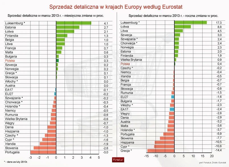 W Polsce według Eurostatu sprzedaż detaliczna wyrównana sezonowo odnotowała wzrost o 0,3 proc. m/m oraz wzrost o 0,4 proc. w ujęciu rocznym w lutym br.