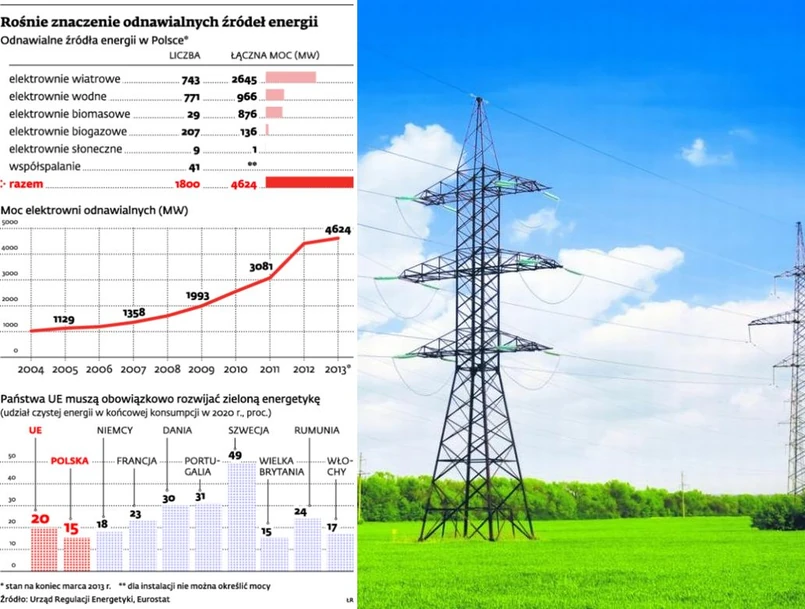 Na koniec marca 2013 r. łączna moc elektrowni produkujących zieloną energię w Polsce przekroczyła 4,6 tys. MW, a produkcja przekroczyła 6,5 GWh energii elektrycznej. Oznacza to wzrost rok do roku o 18 proc. i udział w krajowym zużyciu prądu na poziomie 4 proc. (w 2011 r. było to 3,4 proc.). Kolejny rok z rzędu najistotniejszy przyrost mocy i produkcji odnotowała energetyka wiatrowa. Aż o 41 proc. wzrosła ilość wytwarzanego przez nie prądu. W 2012 r. wiatraki wygenerowały 4 GWh. Urząd Regulacji Energetyki na koniec marca naliczył aż 743 farm wiatrowych. Wybudowane w nich wiatraki mają moc niemal ponad 2,6 tys MW. To aż o 1000 MW więcej niż rok wcześniej (wzrost o ponad 40 proc.). Odnawialna energia powstaje w Polsce nie tylko przy pomocy wiatru. Drugie pod względem mocy elektrownie wodne (jest ich w sumie 771) dają do systemu 966 MW (przybyło 19 siłowni o mocy niespełna 7 MW).