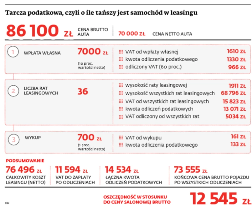 Do kosztów uzyskania przychodu firma może zaliczyć wyłącznie odsetkową część miesięcznego czynszu. Jednocześnie ma prawo do amortyzacji nabytego samochodu i zaliczania jej do kosztów uzyskania przychodu.