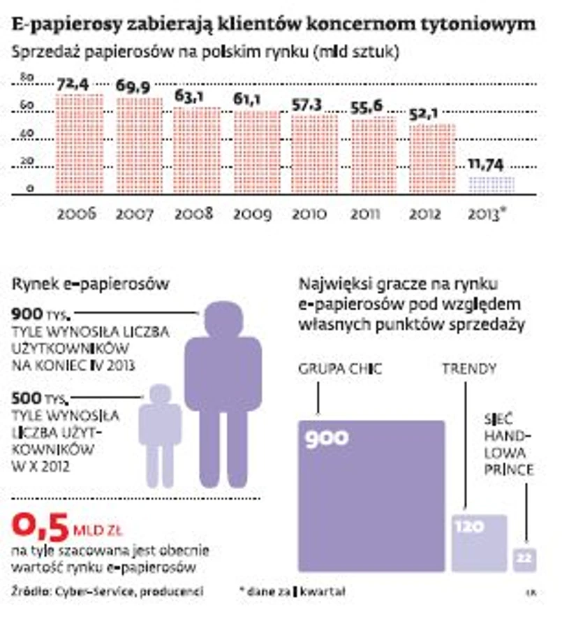 Co na to koncerny tytoniowe? Na świecie same wchodzą na rynek e-papierosów. W grudniu 2012 r. British American Tobacco przejęła brytyjską spółkę CN Creative specjalizującą się w technologii e-papierosów. Z kolei Altria Group należąca do koncernu Philip Morris zapowiedziała kilka tygodni temu, że własne e-papierosy wprowadzi na rynek w ciągu pół roku.