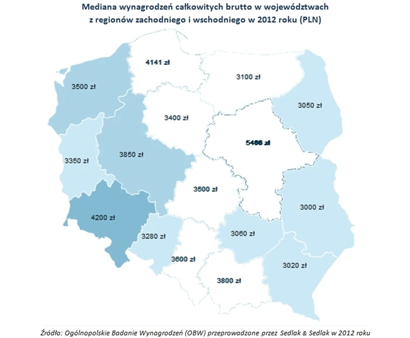 W Ogólnopolskim Badaniu Wynagrodzeń stwierdzono, że we wschodnich regionach (województwa: podlaskie, lubelskie, podkarpackie i świętokrzyskie) mediana zarobków wyniosła w 2012 roku 3 000 zł. W województwach zachodnich (zachodniopomorskim, lubuskim, dolnośląskim, wielkopolskim oraz opolskim) mediana ta wyniosła już 3850 zł.