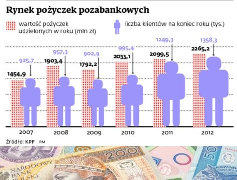 Konferencja Przedsiębiorstw Finansowych zebrała dane od swoich członków w tej branży (10 spółek) i uwzględniła informacje firmy Provident, która do organizacji już nie należy. Z raportu konferencji wynika, że w minionym roku rynek pozabankowych usług pożyczkowych wzrósł – wartość pożyczek zwiększyła się o ok. 8 proc. w porównaniu z 2011 r., a liczba klientów o niecałe 9 proc.