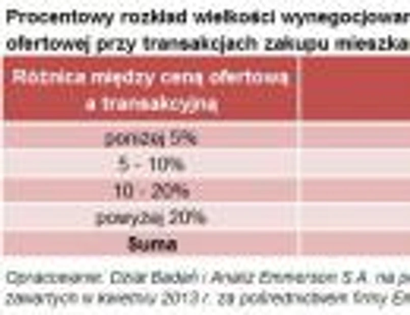 Analiza porównawcza cen ofertowych i transakcyjnych wykazała, że średni wynegocjowany przez nabywców upust wynosił 7 proc. Naturalnie nie w każdym przypadku negocjacje były równie skuteczne. Przy niemal połowie transakcji zawartych za pośrednictwem firmy Emmerson wynegocjowany upust względem pierwotnej ceny nie przekraczał 5 proc.. Z drugiej strony w co czternastej transakcji (7 proc.) nabywcy byli wyjątkowo skuteczni. W toku negocjacji doprowadzili oni do obniżki ceny ofertowej o ponad 20 proc., a w przypadku rekordowej kwietniowej transakcji upust przekraczał 35 proc.