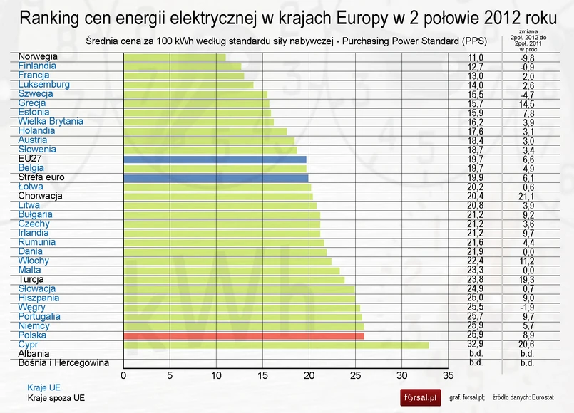 Jeśli uwzględnimy różnice w sile nabywczej mieszkańców poszczególnych państw UE, okaże się jednak, że Polacy znajdują się w ścisłej czołówce krajów z najwyższymi cenami energii w Europie. Cena 100 kWh według parytetu siły nabywczej (czyli w odniesieniu do tego, jaką ilość energii możemy kupić w danych kraju za daną przeciętną pensję) w drugiej połowie ubiegłego roku wyniosła w Polsce 25,9 PPS (z ang. Purchasing Power Standard). Tyle samo płacą bogaci Niemcy. Więcej od nas wydają jedynie mieszkańcy Cypru (32,9 PPS). Wysokie rachunki płaci się też w Portugalii (25,7 PPS) oraz na Węgrzech (25,5 PPS).