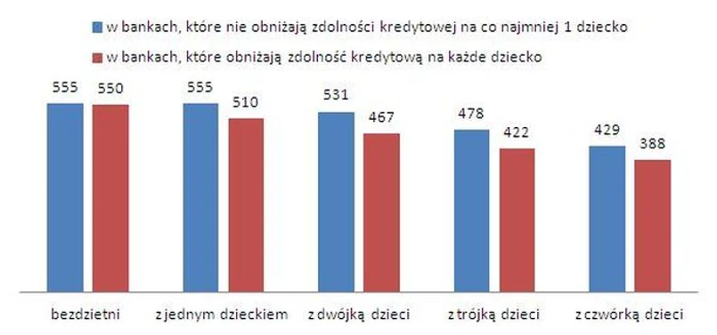 Takie podejście stawia banki na czele prorodzinnych instytucji w naszym kraju. Banki zapewne z góry zakładają, że prędzej czy później rodzina się powiększy, chociaż w „prorodzinnych” bankach średnia, maksymalna zdolność kredytowa na starcie jest nawet wyższa niż w bankach, w których później każde kolejne dziecko obniża możliwości kredytowe.