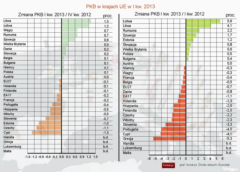 W ujęciu rocznym, PKB spadł w I kw. 2013 r. o 1,1 proc. w strefie euro i o 0,7 proc. w całej UE. Konsensus rynkowy dla strefy euro wynosił 1,0 proc. spadku w tym ujęciu.