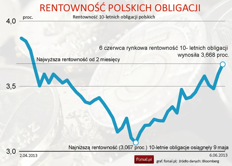 Oprocentowanie polskich 10-letnich papierów dłużnych wzrosło wczoraj o 11 pkt bazowych, do 3,59 proc. – najwyżej od 11 kwietnia. To efekt wczorajszego komentarza Marka Belki, prezesa polskiego banku centralnego, który dał do zrozumienia, że nie należy się spodziewać dalszego luzowania na polskim rynku. Rentowność polskich obligacji poszybowała w górę do poziomu 208 pkt bazowych ponad noty porównywalnych niemieckich bundów denominowanych w euro – to największa różnica między polskimi i benchmarkowymi, niemieckimi papierami o podobnym terminie zapadalności od pięciu tygodni.
