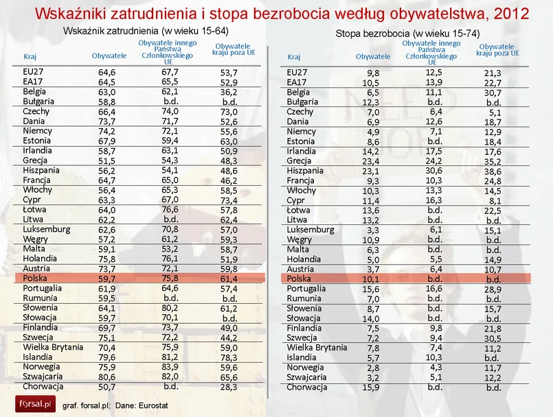 Z ostatnich danych statystycznych Eurostatu można wysnuć ciekawą hipotezę: europejskie kraje rzeczywiście na równi traktują swoich obywateli i przybyszów z UE – problem bezrobocia dotyka w każdym z państw niemal w takim samym stopniu imigrantów, co obywateli. Podobnie jest w przypadku stopy zatrudnienia, która nie różni się znacznie wśród obcokrajowców i przyjezdnych.