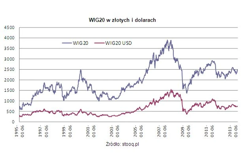 Zastanawiające przy tym jest, dlaczego podobny scenariusz nie realizował się na warszawskim parkiecie. Odpowiedź na to pytanie może tkwić w tym, że tendencja do umacniania się naszej waluty była z punktu widzenia inwestorów zagranicznych niekorzystna i odstraszała ich od naszych akcji. Wymieniając dolary na złote, pozyskując środki na zakup akcji, otrzymywali mniej złotówek, a dodatkowo ryzykowali, że w przypadku odwrócenia się tendencji na rynku walutowym, czyli osłabienia się złotego w przyszłości, stracą ponownie na zamianie naszej waluty na dolary. W o wiele bardziej komfortowej sytuacji znajdują się wówczas, gdy kupują polskie akcje w czasie gdy złoty się osłabia. Wówczas mają szansę skorzystać podwójnie. Raz na korzystnej wymianie dolarów na złote i ponownie złotych na dolary, a drugi raz na wzroście cen kupionych akcji. Mechanizm ten widać częściowo, gdy spojrzeć na nasze indeksy w ujęciu dolarowym.