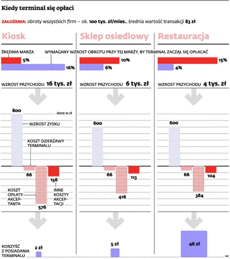 Korzyści z rozpoczęcia akceptacji kart najszybciej odniesie restauracja. Nieco dłużej będzie na nie czekał osiedlowy sklep spożywczy. Przy obecnych kosztach obsługi kart niewielkie szanse ma na to kiosk z gazetami. Skąd taki wniosek? Panuje przekonanie, że rozpoczęcie akceptacji kart płatniczych przyczynia się do wzrostu przychodów większości punktów handlowo-usługowych. W przekazie organizacji płatniczych i banków ma to uzasadniać wysokie prowizje, ponoszone przez detalistów za przywilej przyjmowania płatności bezgotówkowych. Handlowcy kontrargumentują jednak, że wcale tak pięknie nie jest. – Dziś marże handlowe są tak niskie, że w niektórych sytuacjach koszty akceptacji kart pożerają większość zysku przedsiębiorców – uważa Karol Stec z departamentu prawnego Polskiej Organizacji Handlu i Dystrybucji. Postanowiliśmy więc sprawdzić, kiedy rozpoczęcie akceptacji kart będzie opłacalne.